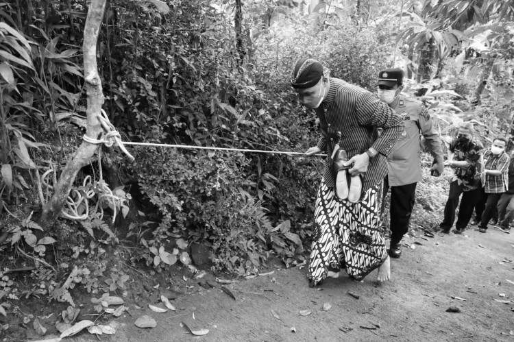 Untuk mencapai rumah keduanya, Ganjar dan rombongan cukup direpotkan dengan medan yang dilalui. Ganjar yang memakai beskap, akhirnya memilih melepaskan selopnya dan nyeker dengan berpegangan pada tali pengaman.[]